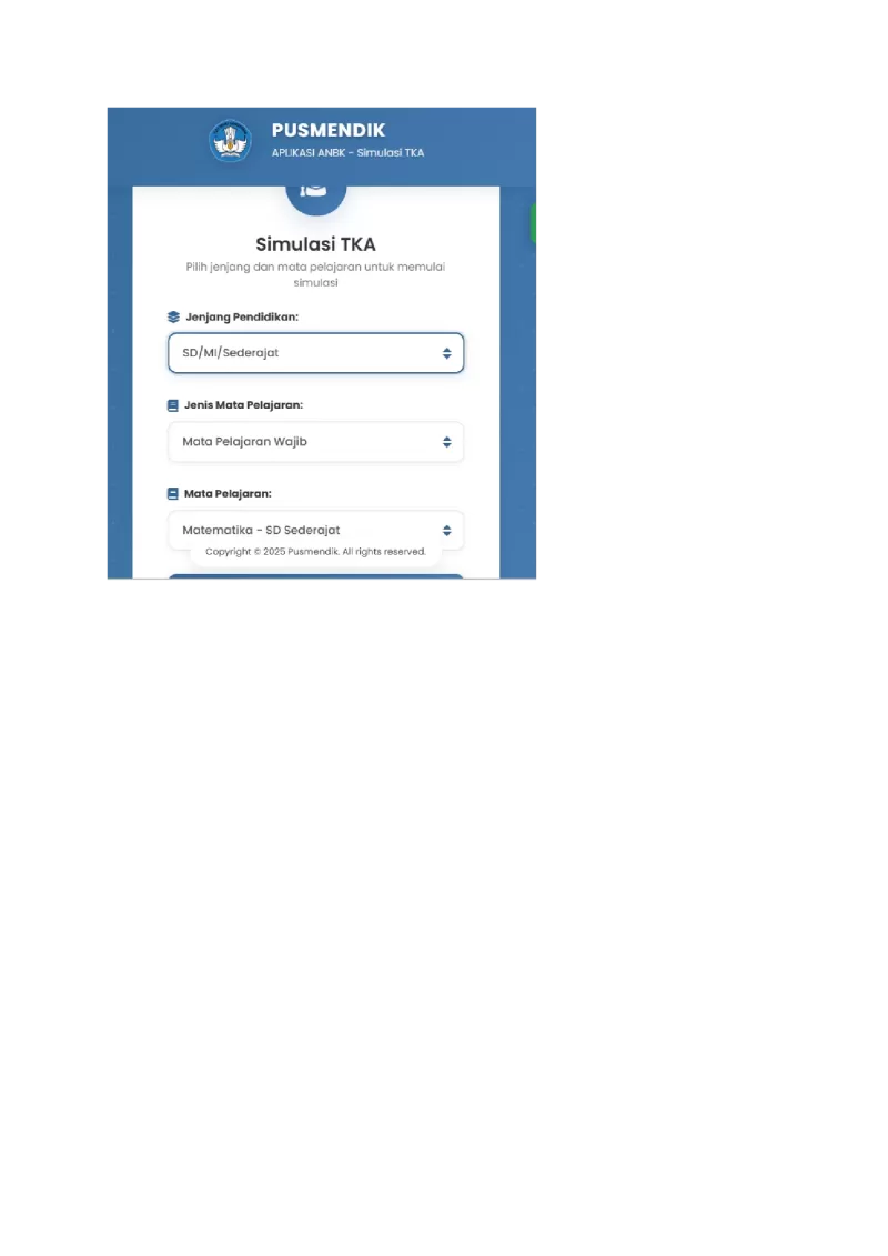 - Menentukan Jenjang dan Mata Pelajaran Masuk ke situs simulasi silahkan klik link (https://pusmendik.kemendikdasmen.go.id/tka/simulasi_tka,) lalu pilih jenjang pendidikan (SD/MI). Selanjutnya, tentukan kategori mata pelajaran wajib dan pilih mata pelajaran yang ingin disimulasikan, misalnya Bahasa Indonesia.